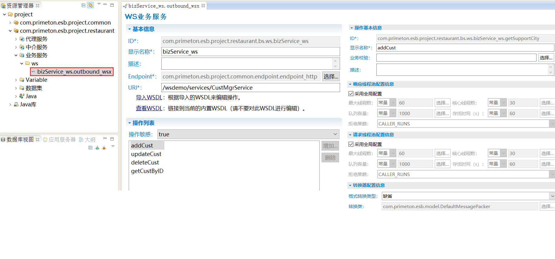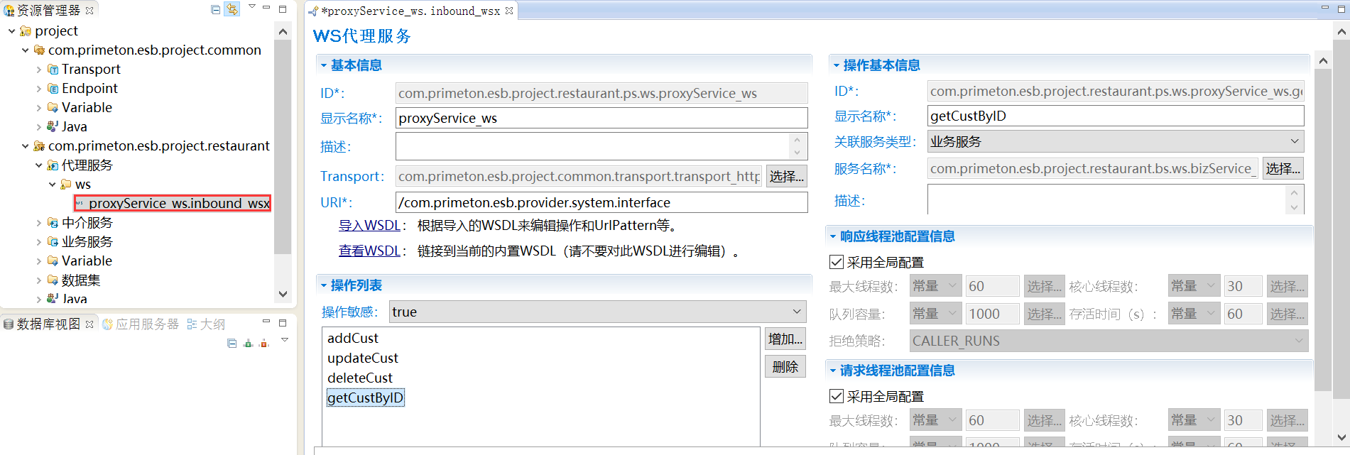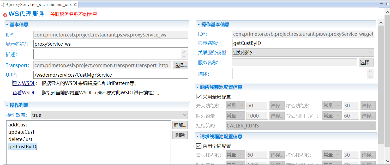在WS代理服务编辑界面中导入WSDL后,还需要设置“操作列表”中每个操作所对应的WS业务服务。单击“操作列表”中的操作“getCustByID”,会打开设置该操作相关信息的界面,如下图所示。