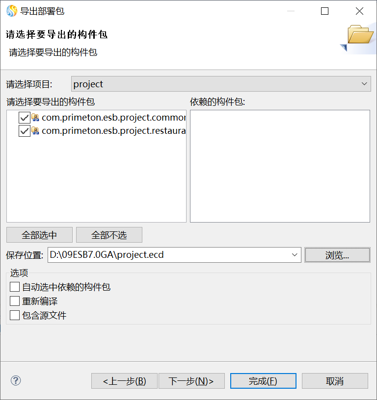 在弹出的"导出部署包"窗口中选择这两个Module,并指定"保存位置",将部署包命名为project.ecd,单击"下一步",如下图所示。