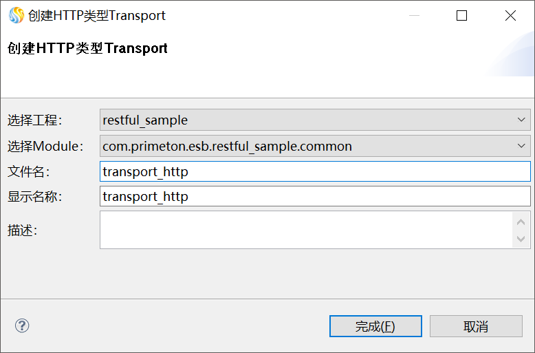 2. 在弹出的“创建HTTP类型Transport”界面,选择当前的工程、Module,并输入文件名及显示名称,如下图所示。