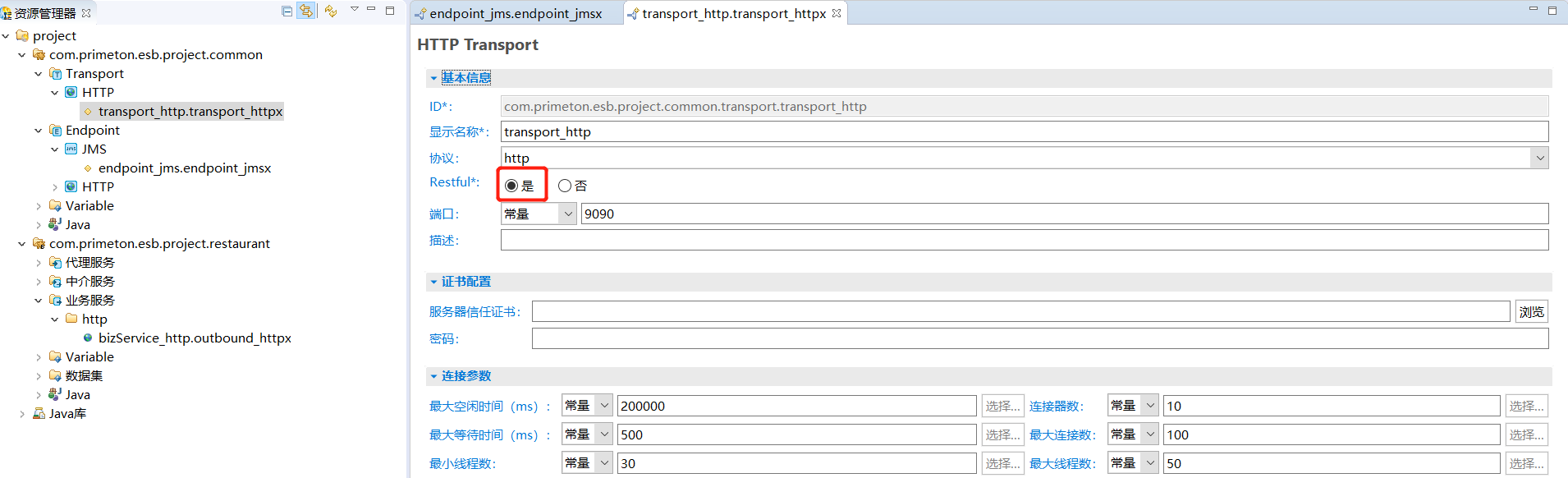 4. 在资源管理器中,双击创建的HTTP Transport,打开HTTP Transport编辑器,修改相关参数。如下所示。