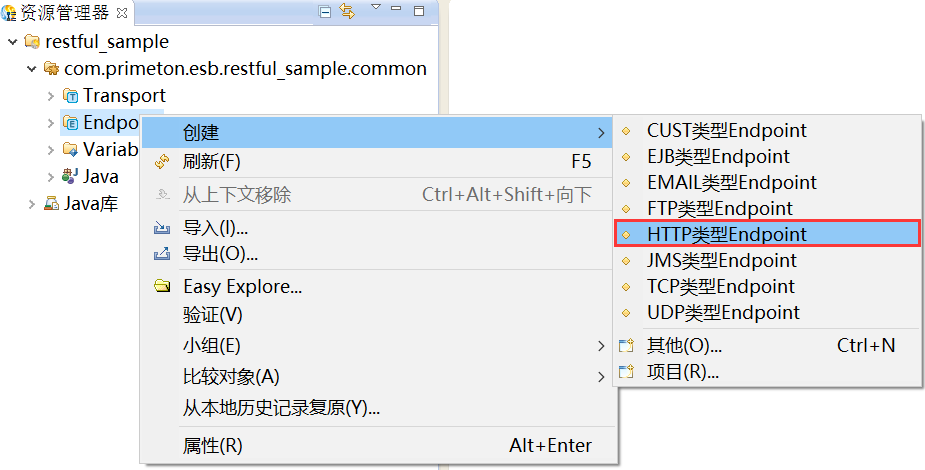 1. 在创建的ESB项目的“Endpoint”上,右键选择“创建 > HTTP类型Endpoint”,如下图所示。