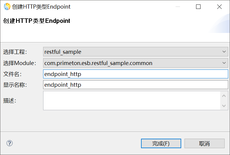2. 在弹出的“创建HTTP类型Endpoint”界面,选择当前的工程、Module,并输入文件名及显示名称,如下图所示。