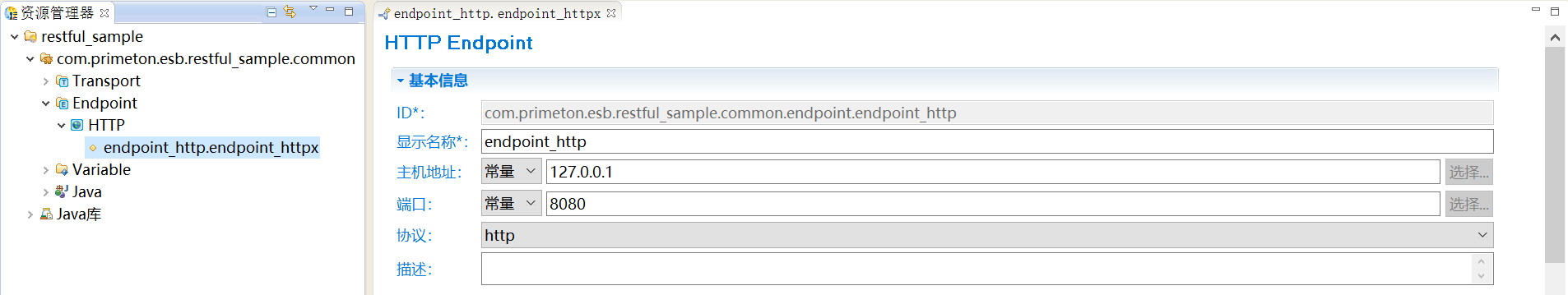 4. 在资源管理器中,双击创建的HTTP Endpoint,打开HTTPEndpoint编辑器,修改相关参数。如下所示。