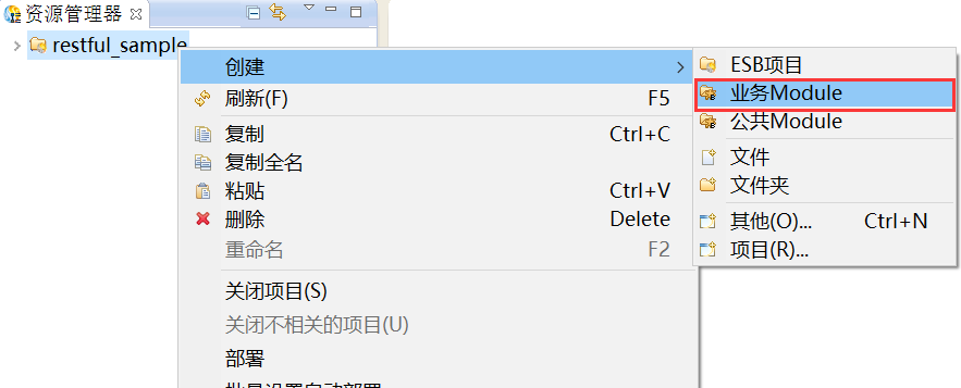 1. 在资源管理器中,选中创建好的项目,鼠标右键选择“创建 > 业务Module”,创建业务Module,如下图所示。