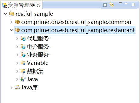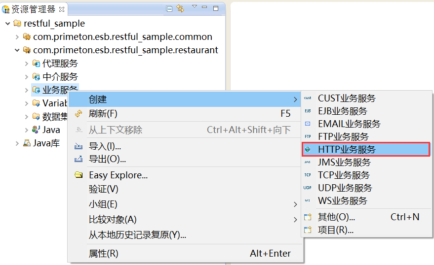 4. 在新建的业务Module“com.primeton.esb.restful_sample.restaurant”的“业务服务”上,鼠标右键选择“创建 > HTTP业务服务”,创建HTTP业务服务,如下图所示。