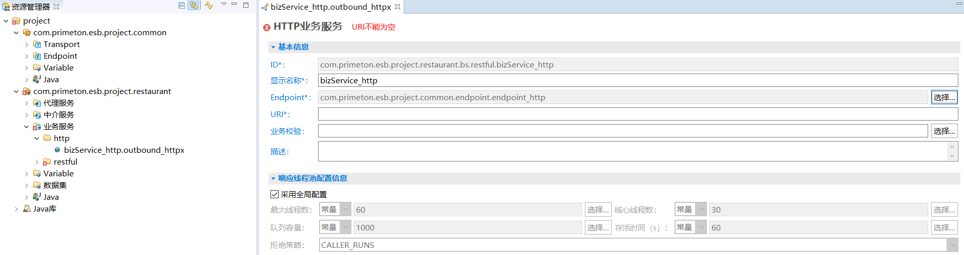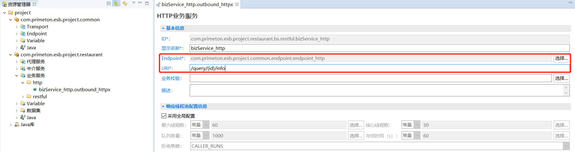 6. 单击“完成”,在打开的“HTTP业务服务”的编辑界面中,需要选择Endpoint和填写URI信息,如下图所示。