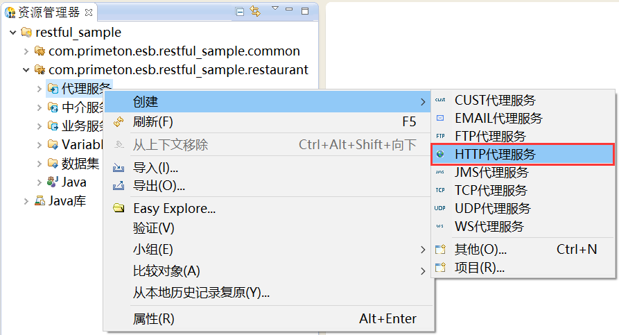 1. 在资源管理器中,在新建的业务Module“com.primeton.esb.restful_sample.restaurant”的“代理服务”上,鼠标右键选择“创建 > HTTP代理服务”,创建HTTP代理服务,如下图所示。