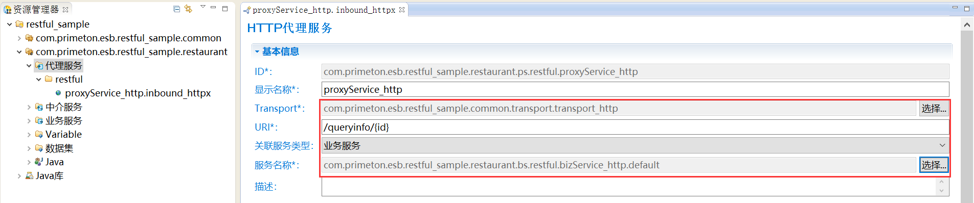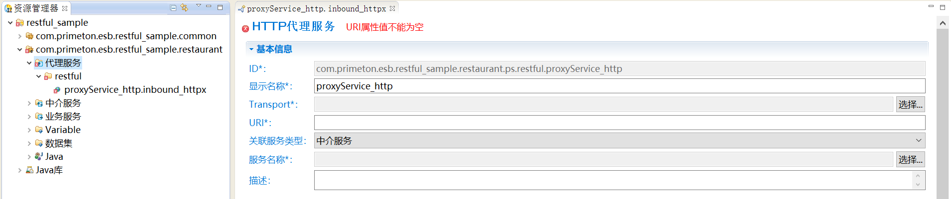 3. 单击“完成”,在打开的“HTTP代理服务”的编辑界面中,需要选择Transport和填写URI信息,如下图所示。