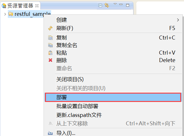 1. 在资源管理器中,选中创建好的项目,鼠标右键单击“部署”,如下图所示。