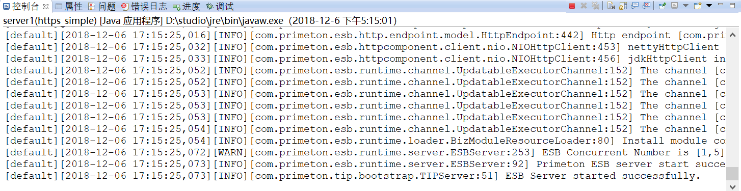 4. 在ESB Studio控制台,看到“ESB Server started successfully.”日志字样,表示ESB Server启动成功,如下图所示。