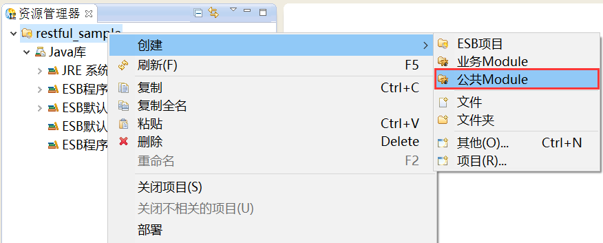 1. 在资源管理器中,选中创建好的项目,鼠标右键选择“创建 > 公共Module”,创建公共Module,如下图所示。