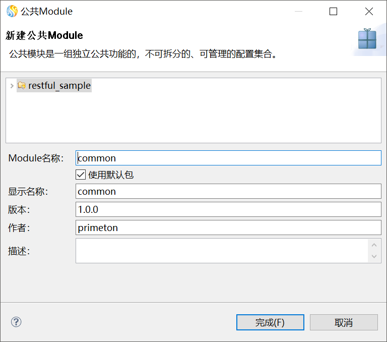 2. 在“公共Module”对话框中,填写Module名称等信息,如下图所示。