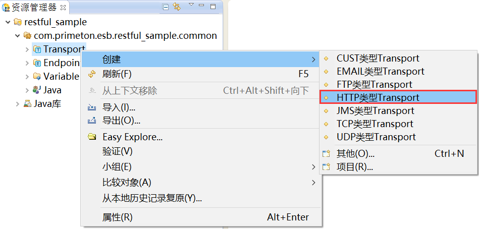 1. 在创建的ESB项目的“Transport”上,右键选择“创建 > HTTP类型Transport”,如下图所示。