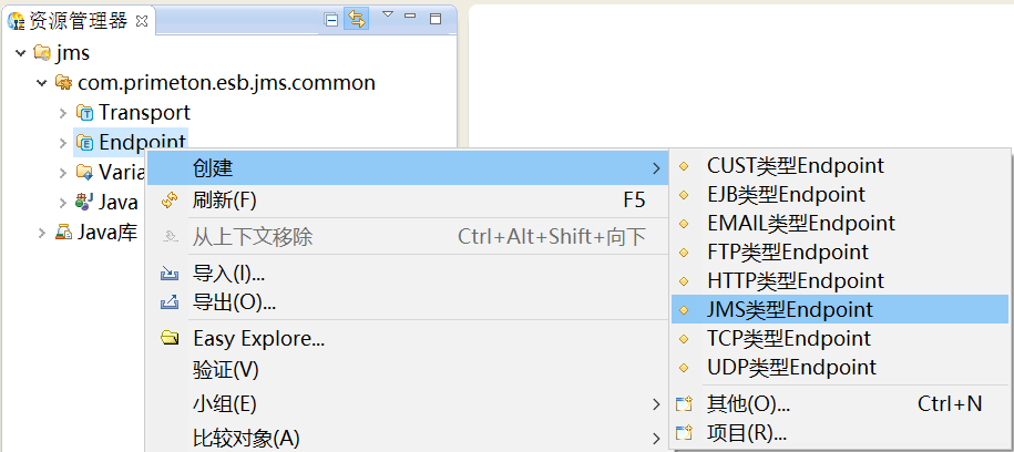 在创建的ESB项目的“Endpoint”上,右键选择“创建 > JMS类型Endpoint”,如下图所示。