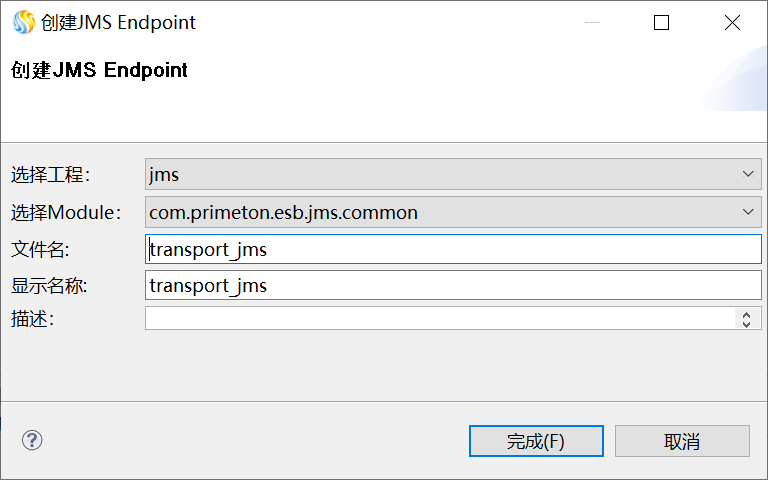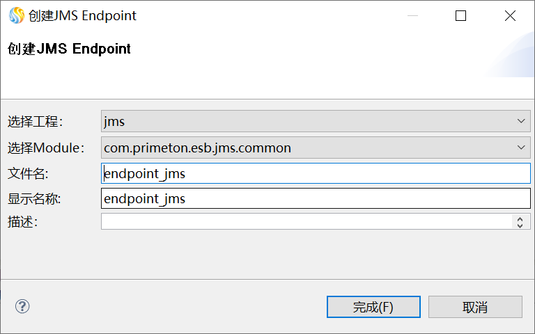 在弹出的“创建JMS类型Endpoint”界面,选择当前的工程、Module,并输入文件名及显示名称,如下图所示。