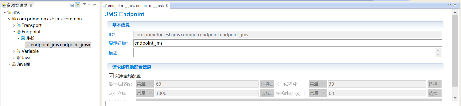 单击“完成”,打开JMS Endpoint编辑器,修改相关参数,JMS Endpoint创建完成,如下图所示。