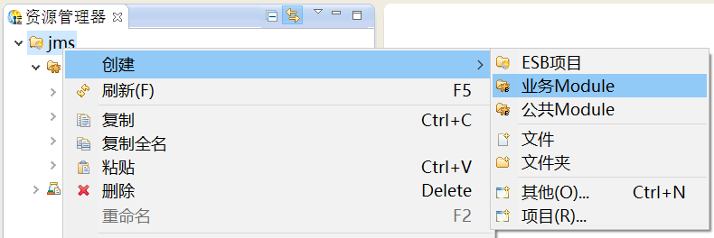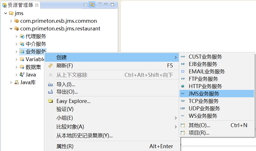 在资源管理器中,在新建的“业务服务”上,鼠标右键选择“创建 > JMS业务服务”,创建JMS业务服务,如下图所示。