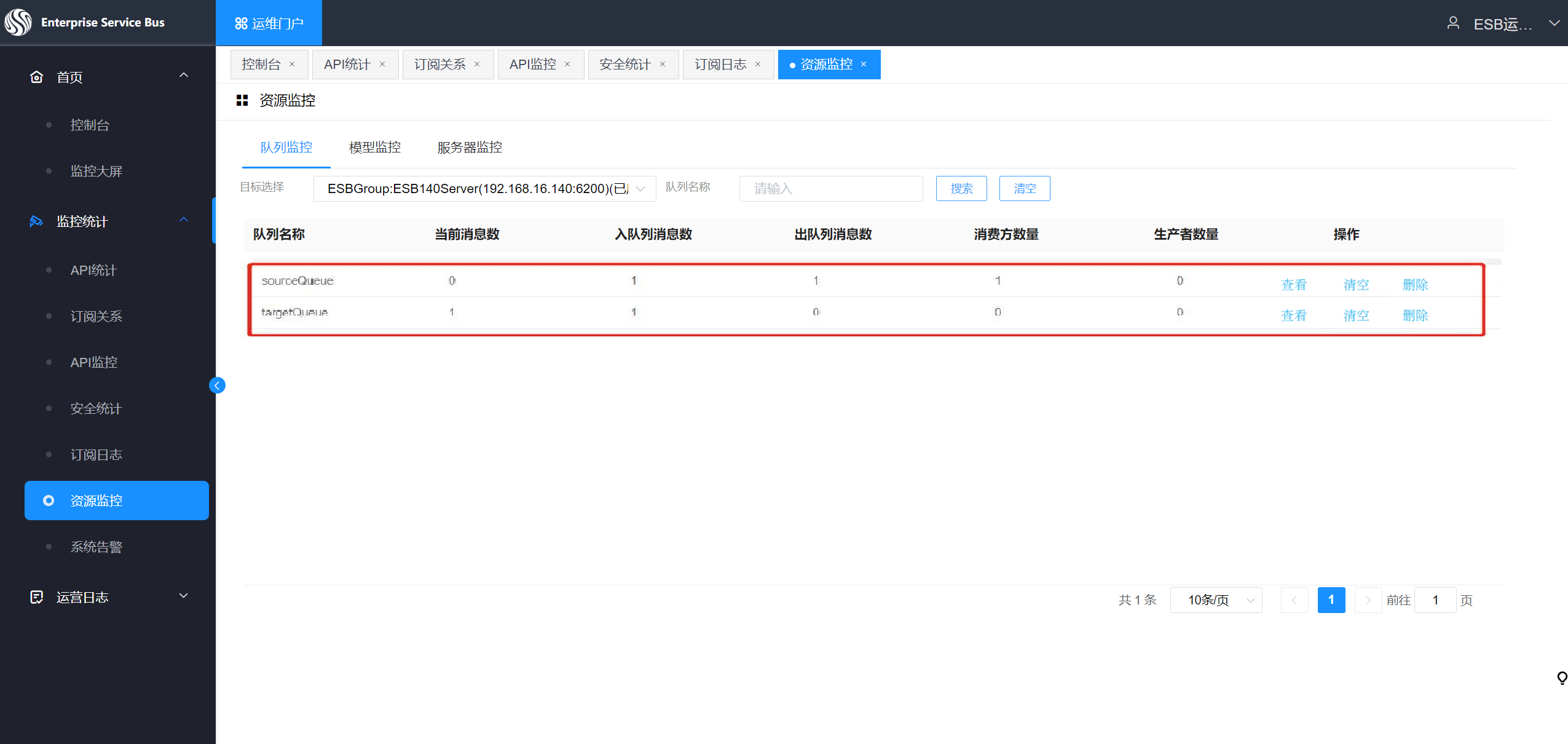 使用运维账户登录,单击左侧导航树上的 “监控统计 >资源监控> 队列监控” ,右侧区域显示 “队列监控” 界面。
