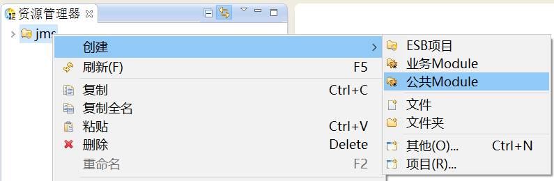 在资源管理器中,在“代理服务”上,鼠标右键选择“创建 > JMS代理服务”,创建JMS代理服务,如下图所示。