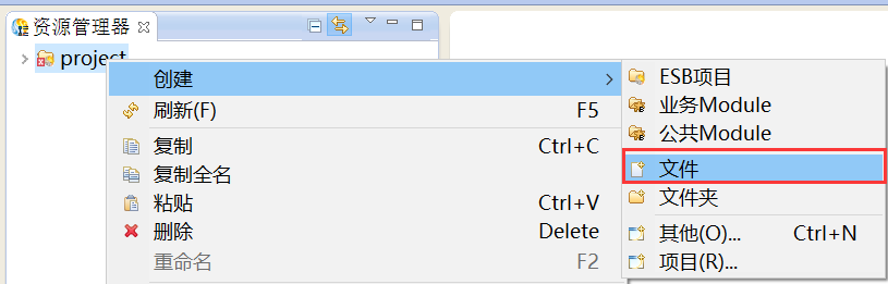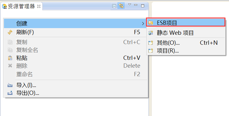 在资源管理器中,鼠标右键选择“创建 > ESB项目”,创建ESB项目,如下图所示。