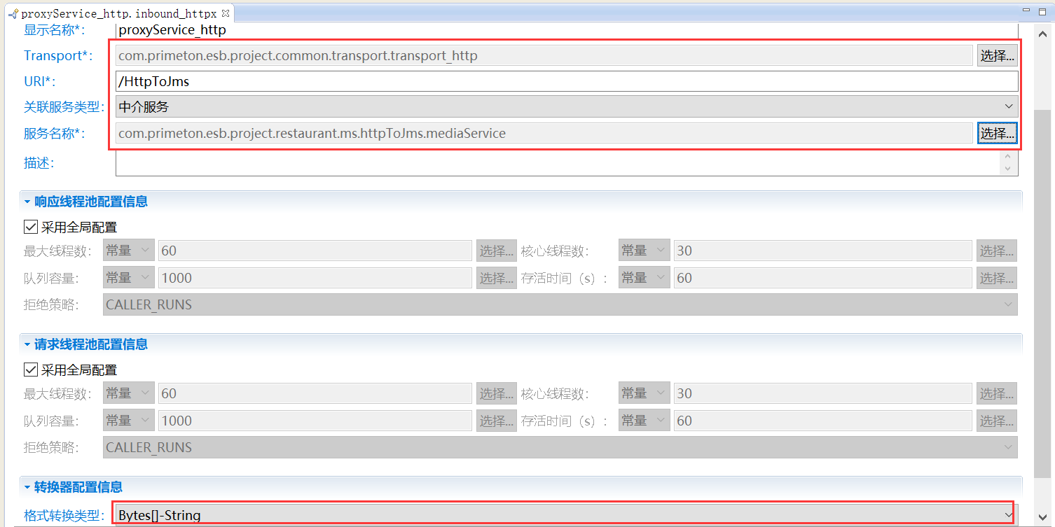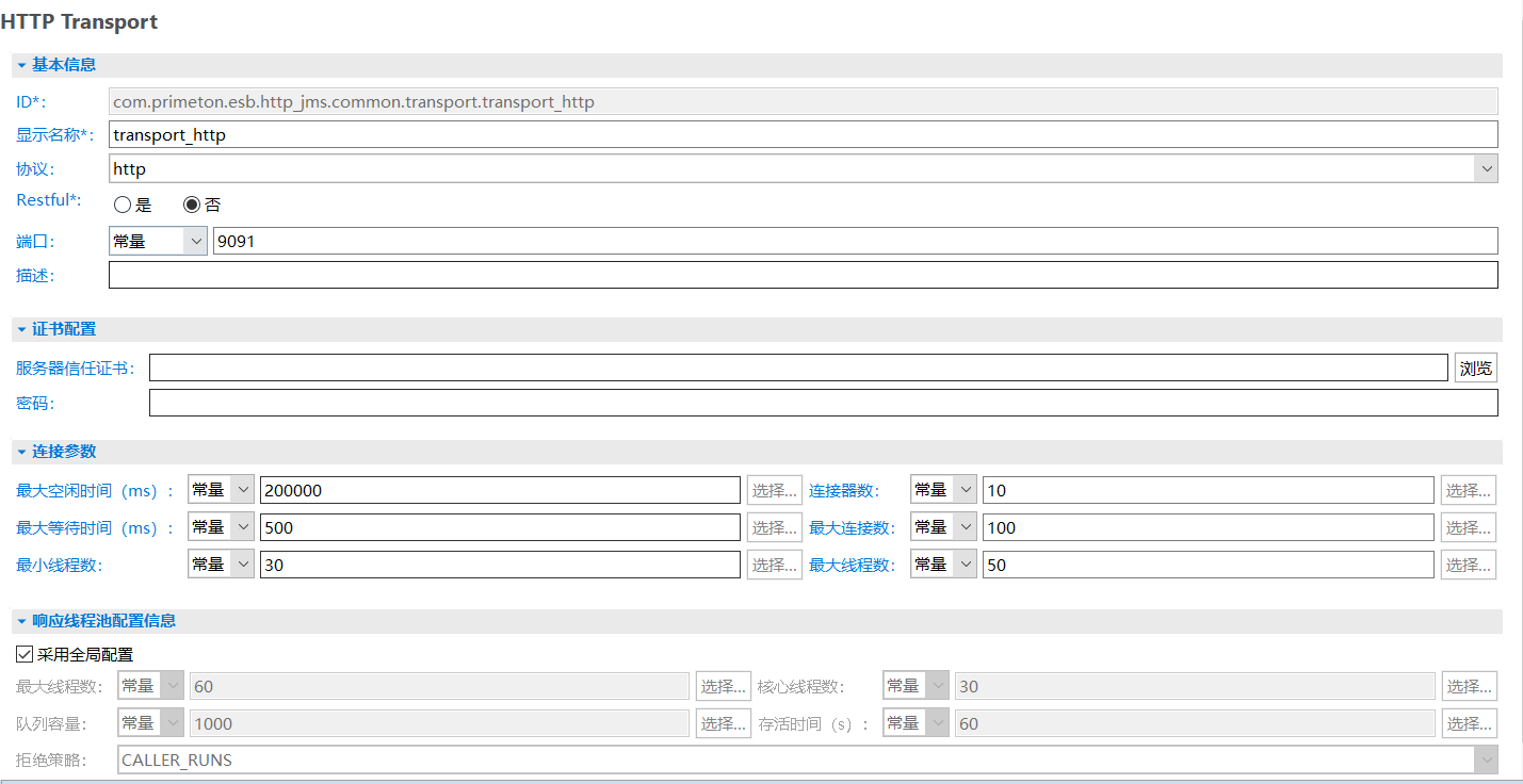 在资源管理器中,双击创建的HTTP Transport,打开HTTP Transport编辑器,修改相关参数。如下所示。