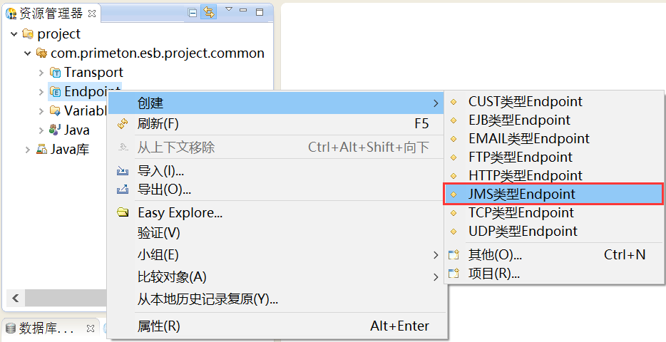在创建的ESB项目的“Endpoint”上,右键选择“创建 > JMS类型Endpoint”,如下图所示。