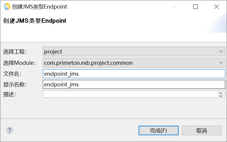 在弹出的“创建JMS类型Endpoint”界面,选择当前的工程、Module,并输入文件名及显示名称,如下图所示。
