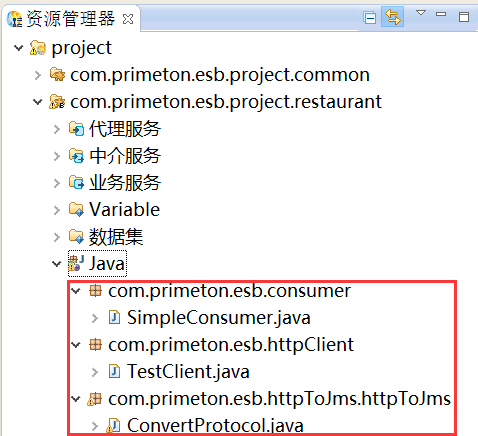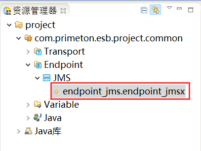 单击“完成”,系统返回ESB开发透视图,创建的项目在"资源管理器"视图中显示,如下图所示。