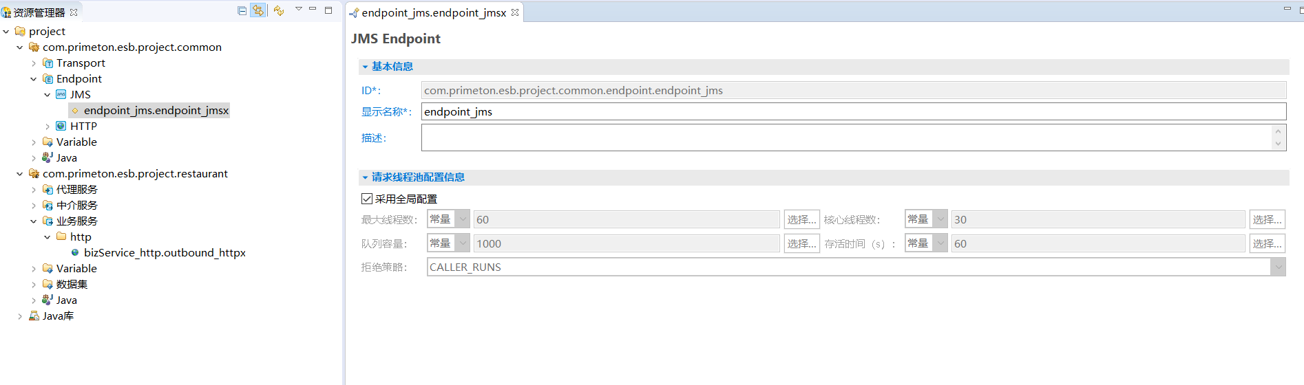 在资源管理器中,双击创建的JMS Endpoint,打开JMS Endpoint编辑器,修改相关参数。如下所示。