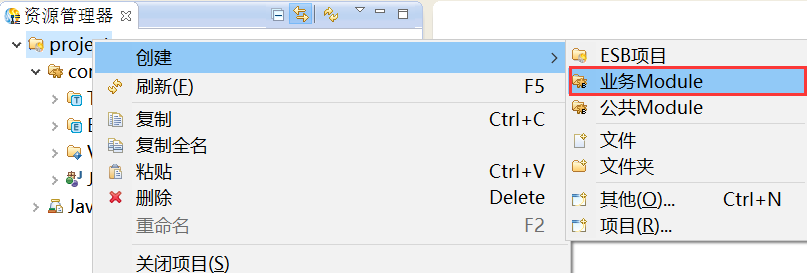 在资源管理器中,选中创建好的项目,鼠标右键选择“创建 > 业务Module”,创建业务Module,如下图所示。