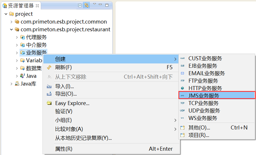 在资源管理器中,在新建的业务Module“com.primeton.esb.project.restaurant”的“业务服务”上,鼠标右键选择“创建 > JMS业务服务”,创建JMS业务服务,如下图所示。