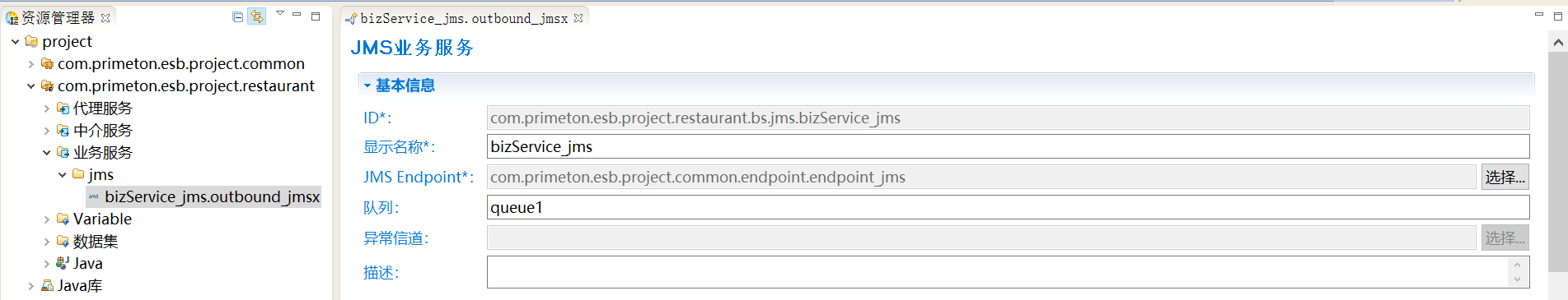 单击“完成”,在打开的“JMS业务服务”的编辑界面中,编辑生成的JMS业务服务的文件。选择刚刚创建的JMS Endpoint,填写队列名为“queue1”,如下图所示。