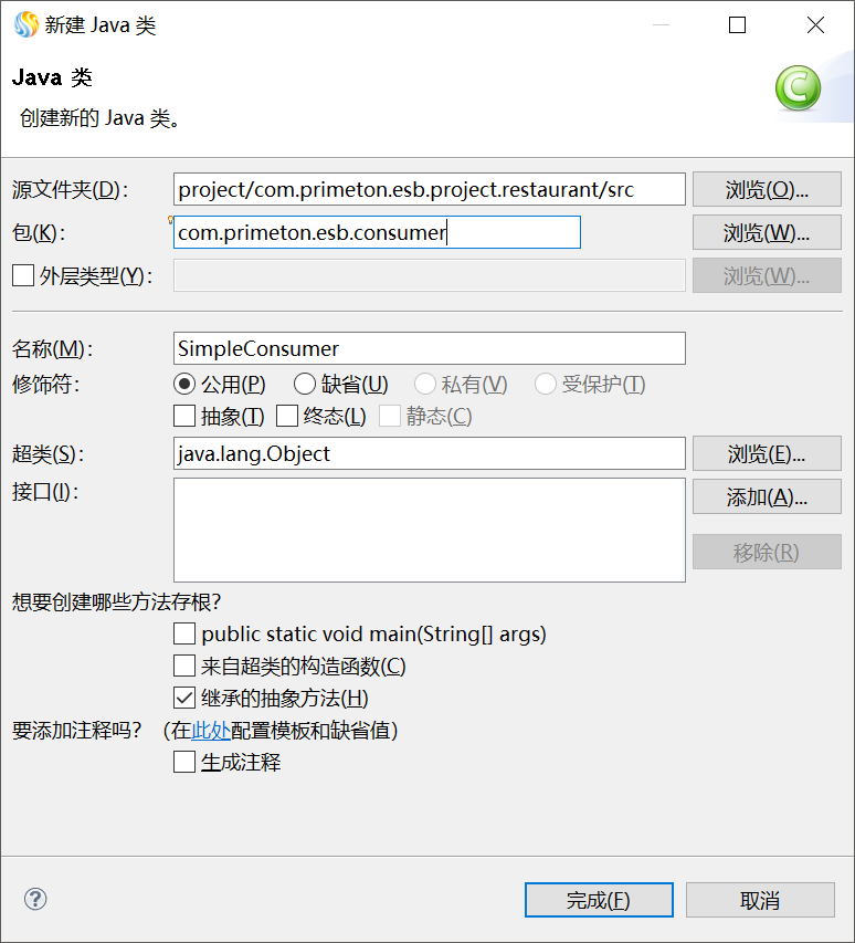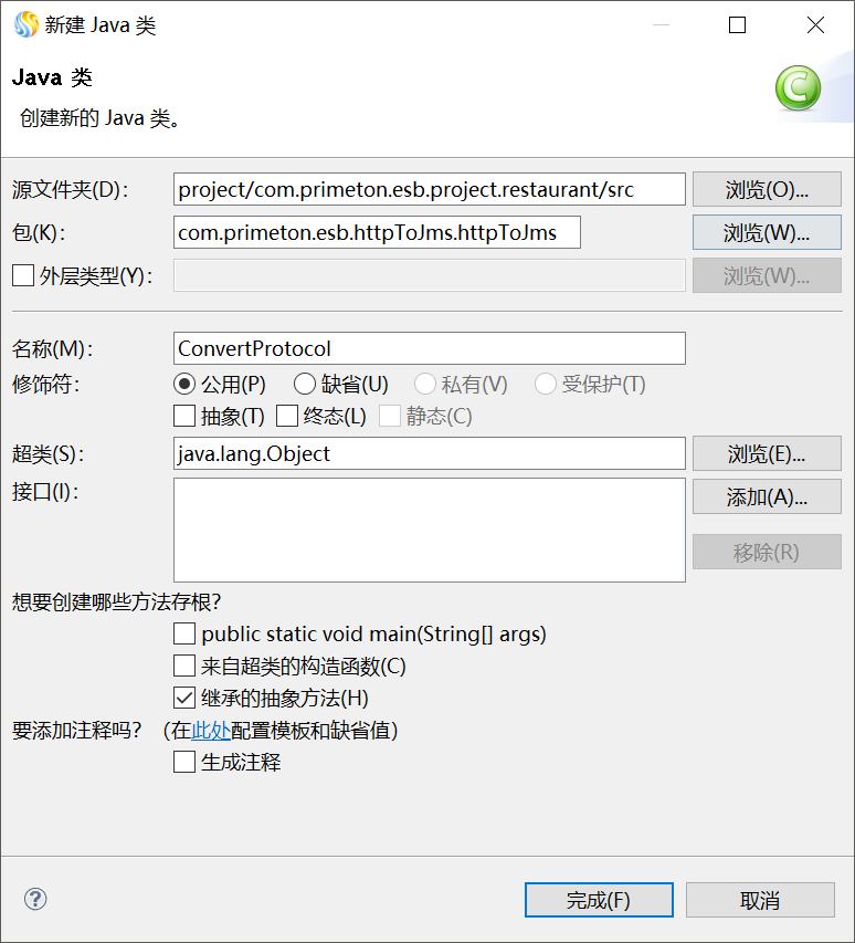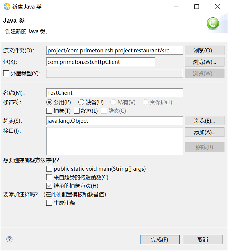 在弹出的"新建Java类"向导中输入相应信息后,点击"完成"按钮即可,如下图所示。
