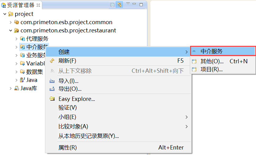 在资源管理器中,在新建的业务Module“com.primeton.esb.project.restaurant”的“中介服务”上,鼠标右键选择“创建 > 中介服务”,如下图所示。