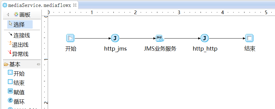 在"中介服务"编辑页面单击“服务编排”链接,进入编排中介服务的界面。在"选用板"中将"JAVA方法"和"JAVA业务服务"图元拖拽到右边的编辑区,并用"连接线"依次连接,如下图所示。