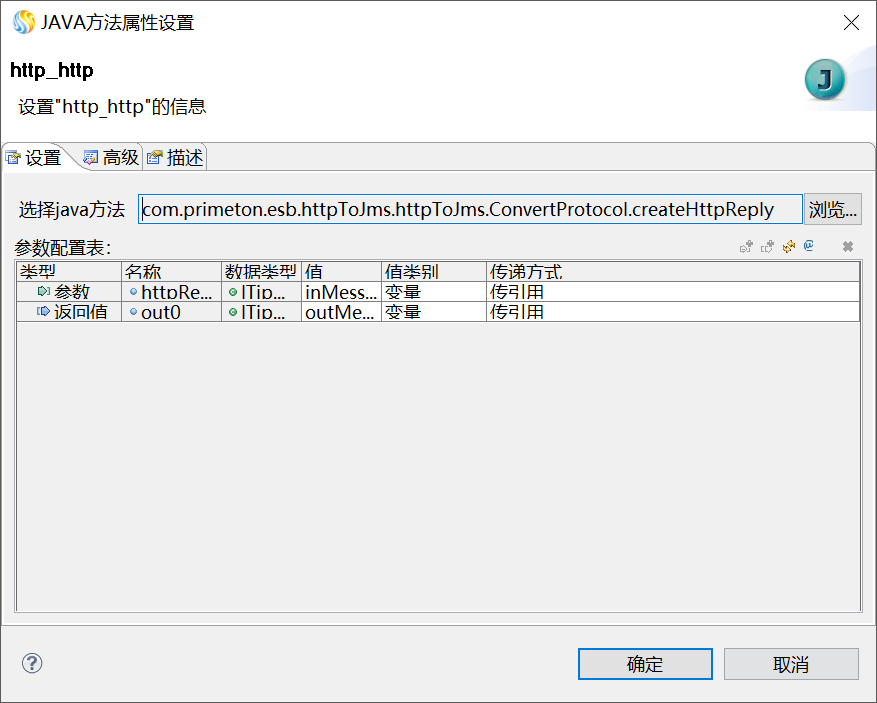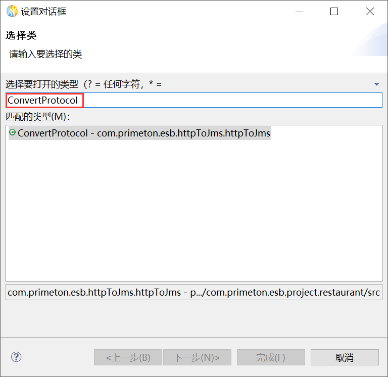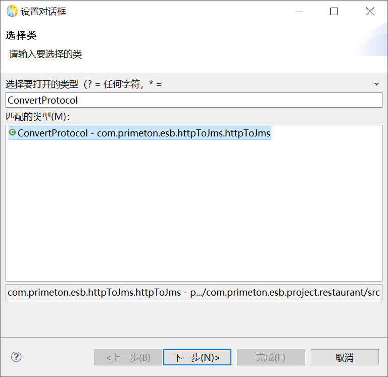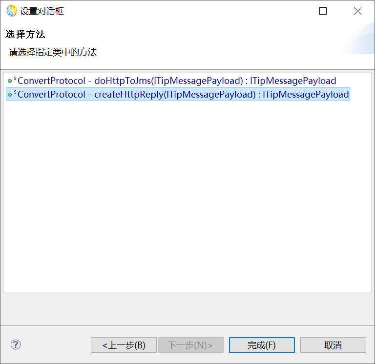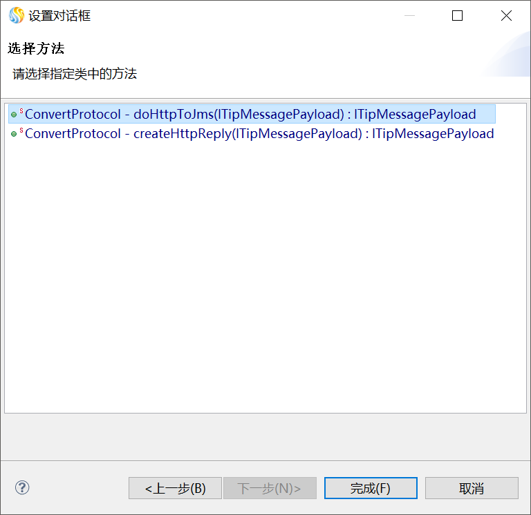 双击编辑区中的"http_jms"JAVA方法图元,在"JAVA方法属性设置"窗口中,单击"浏览...",弹出"选择java方法"窗口,在"选择要打开的类型的输入框中输入类名"ConvertProtocol",在"匹配的类型"中选中ConvertProtocol,单击“下一步”再选中doHttpToJms方法,如下图所示。