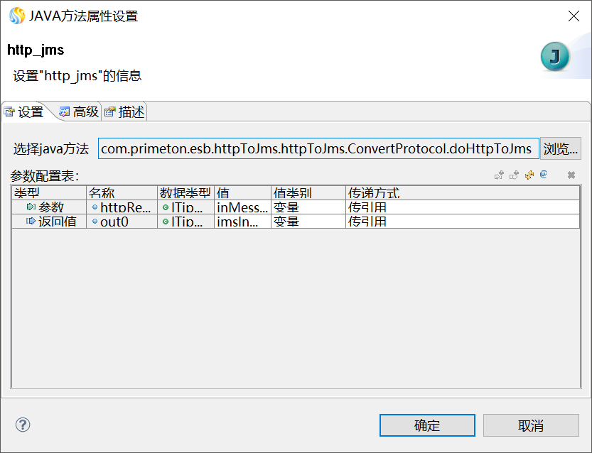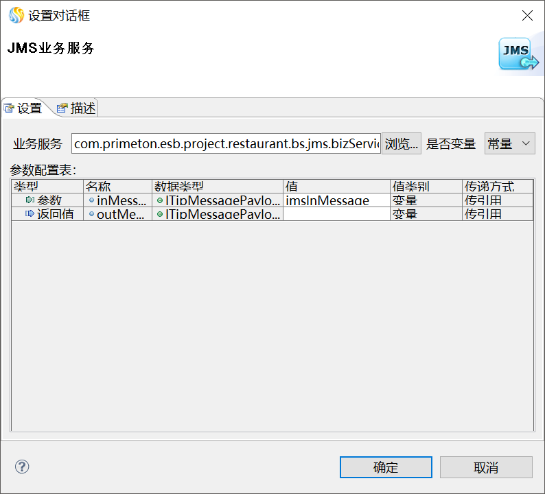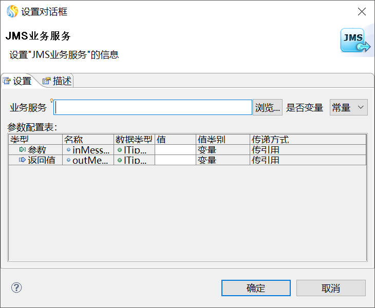 双击编辑区中的"JMS业务服务"图元,弹出JMS业务服务的"设置对话框",单击"浏览...",如下图所示。