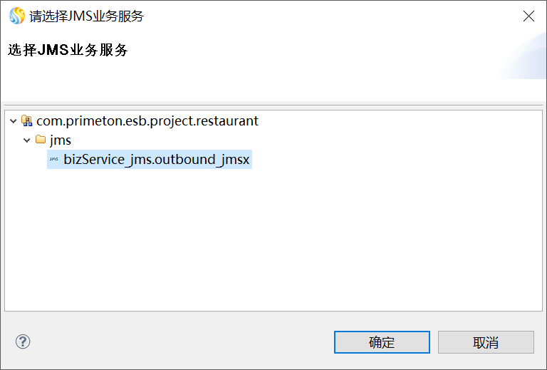 在弹出的"请选择JMS业务服务"窗口中,选择对应的JMS业务服务,单击“确定”,如下图所示。