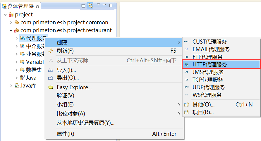在资源管理器中,在新建的业务Module“com.primeton.esb.project.restaurant”的“代理服务”上,鼠标右键选择“创建 > HTTP代理服务”,创建HTTP代理服务,如下图所示。
