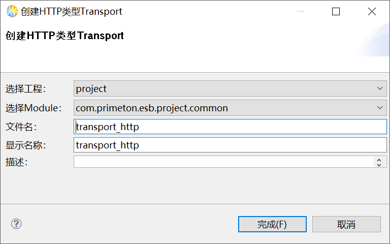 在弹出的“创建HTTP类型Transport”界面,选择当前的工程、Module,并输入文件名及显示名称,如下图所示。