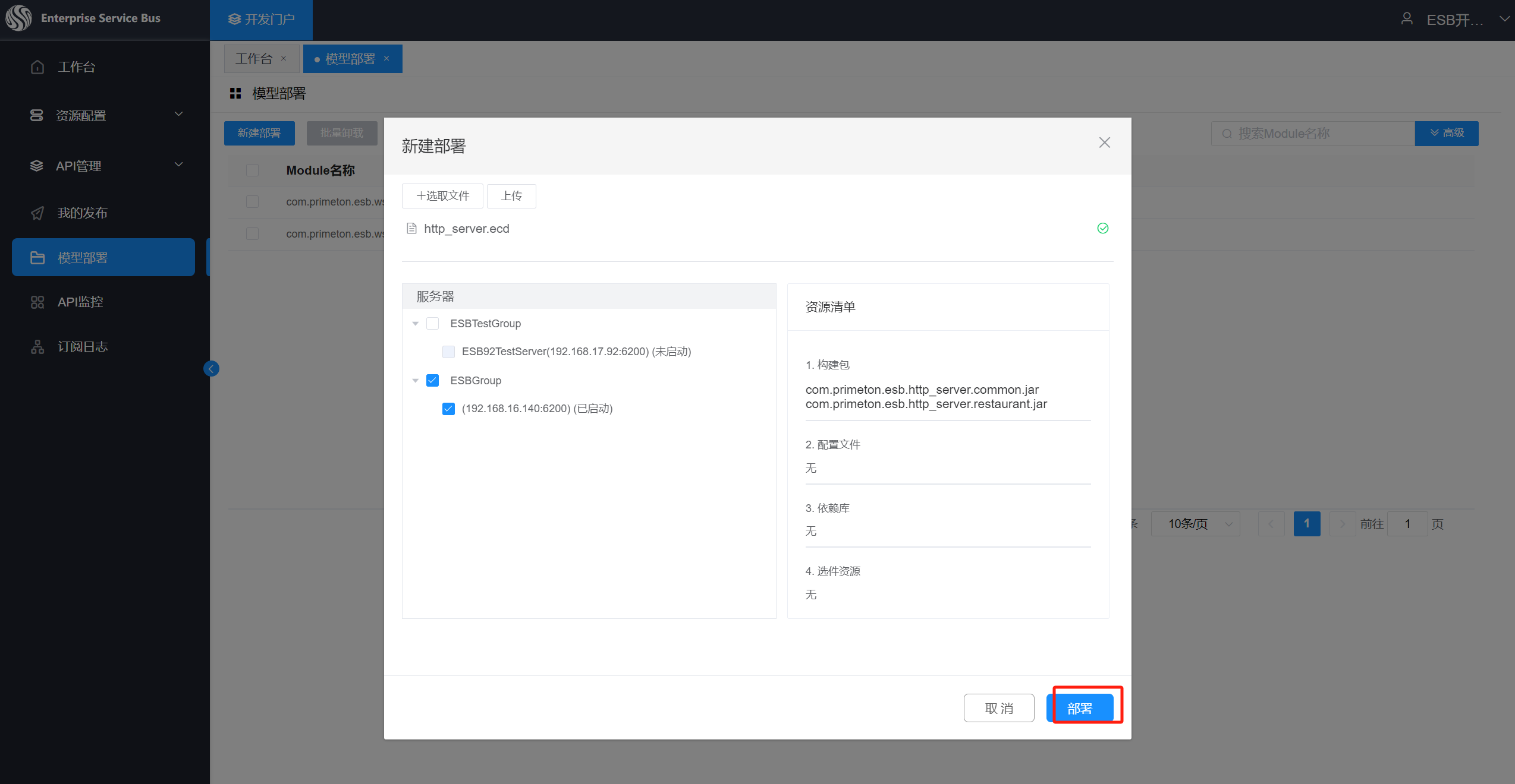 勾选“服务器”,点击“部署”,将模型部署到服务器。