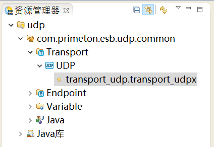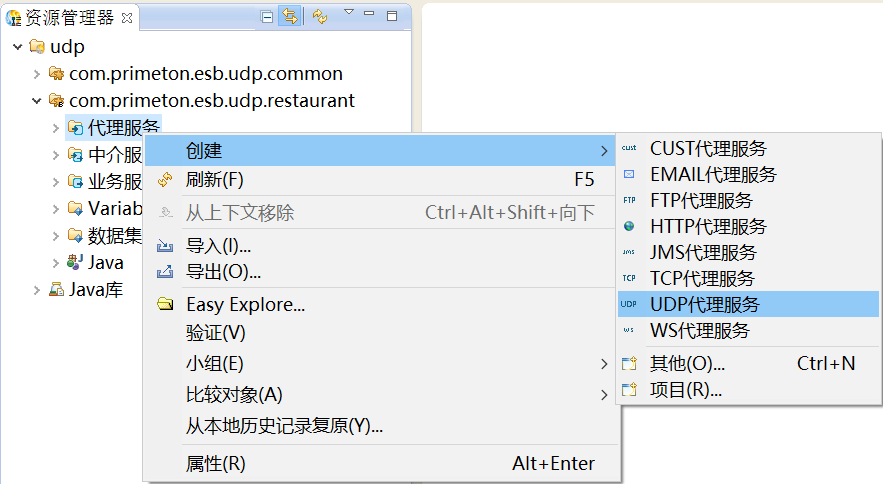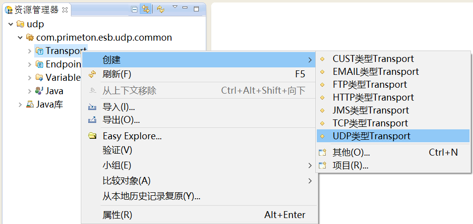 在创建的ESB项目的“Transport”上,右键选择“创建 > UDP类型Transport”,如下图所示。