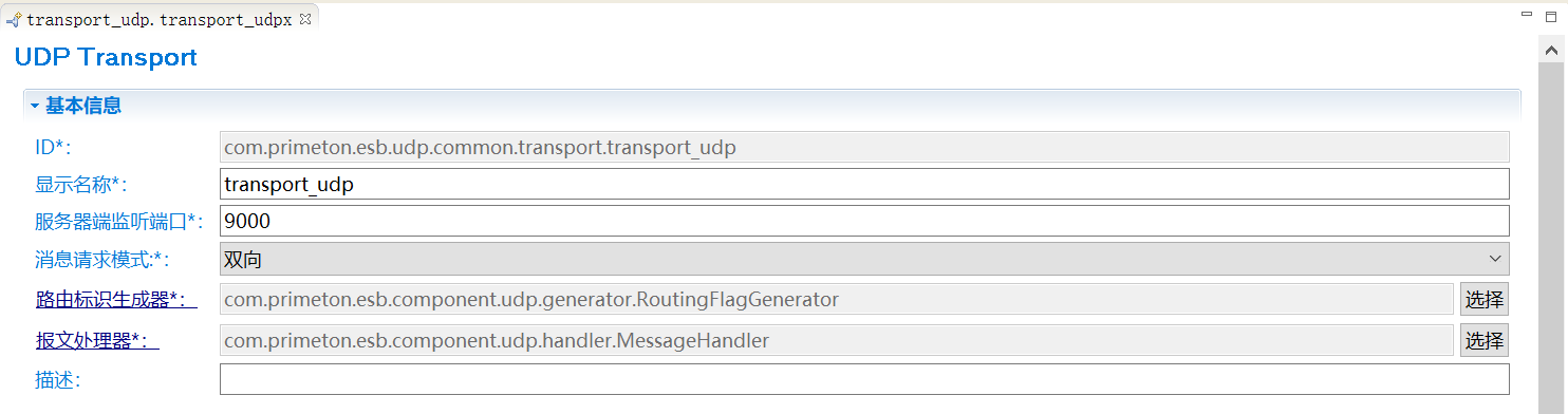 在资源管理器中,双击创建的UDP Transport,打开UDP Transport编辑器,修改相关参数。如下所示。
