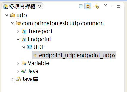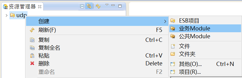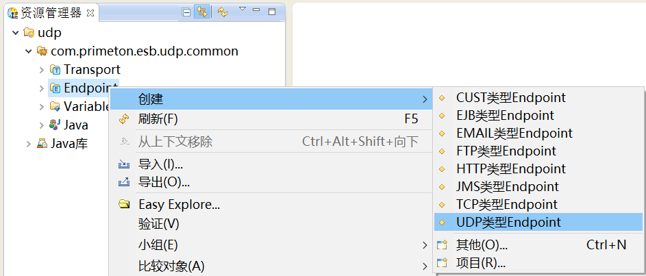 在创建的ESB项目的“Endpoint”上,右键选择“创建 > UDP类型Endpoint”,如下图所示。