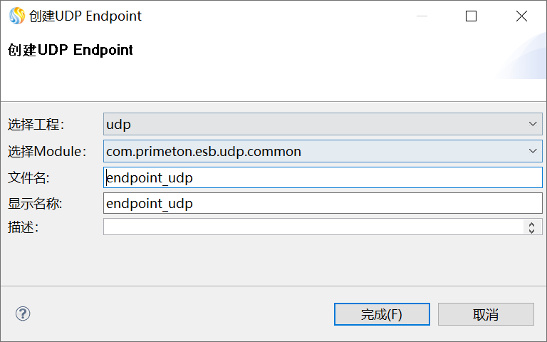 在弹出的“创建UDP类型Endpoint”界面,选择当前的工程、Module,并输入文件名及显示名称,如下图所示。