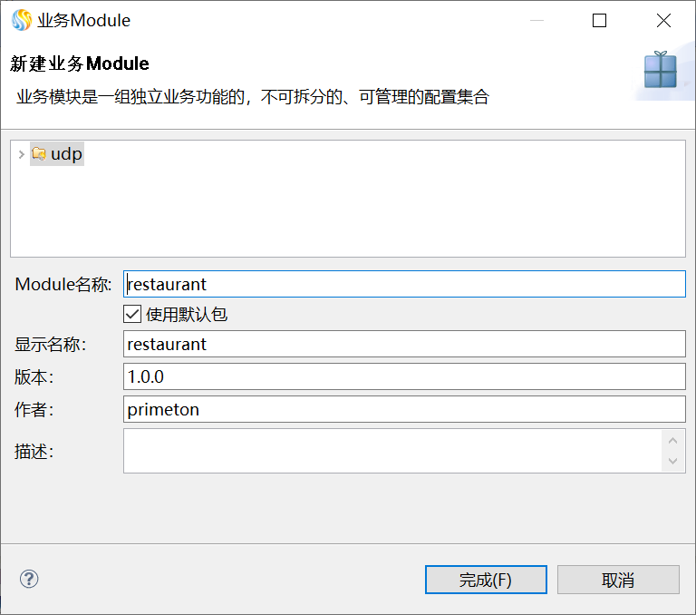 在“业务Module”对话框中,填写Module名称等信息,如下图所示。