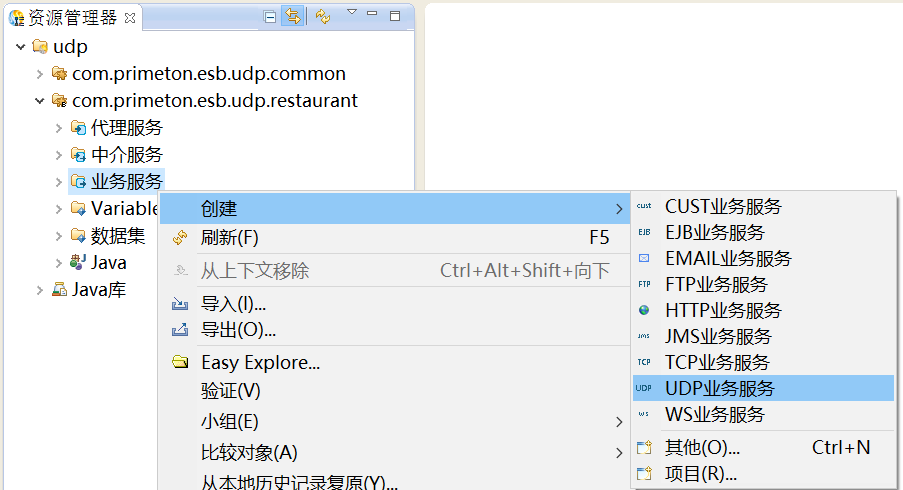 在资源管理器中,在新建的“业务服务”上,鼠标右键选择“创建 > UDP业务服务”,创建 UDP业务服务,如下图所示。