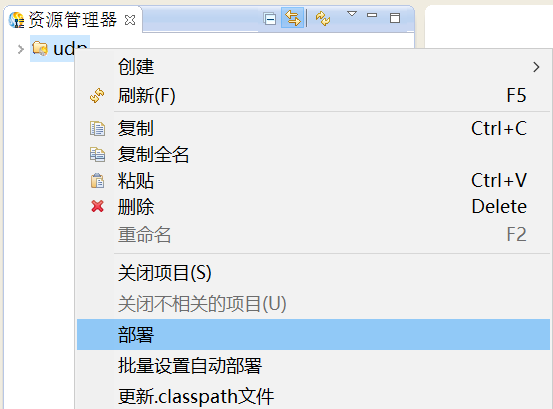 在资源管理器中,选中创建好的项目,鼠标右键单击“部署”,如下图所示。