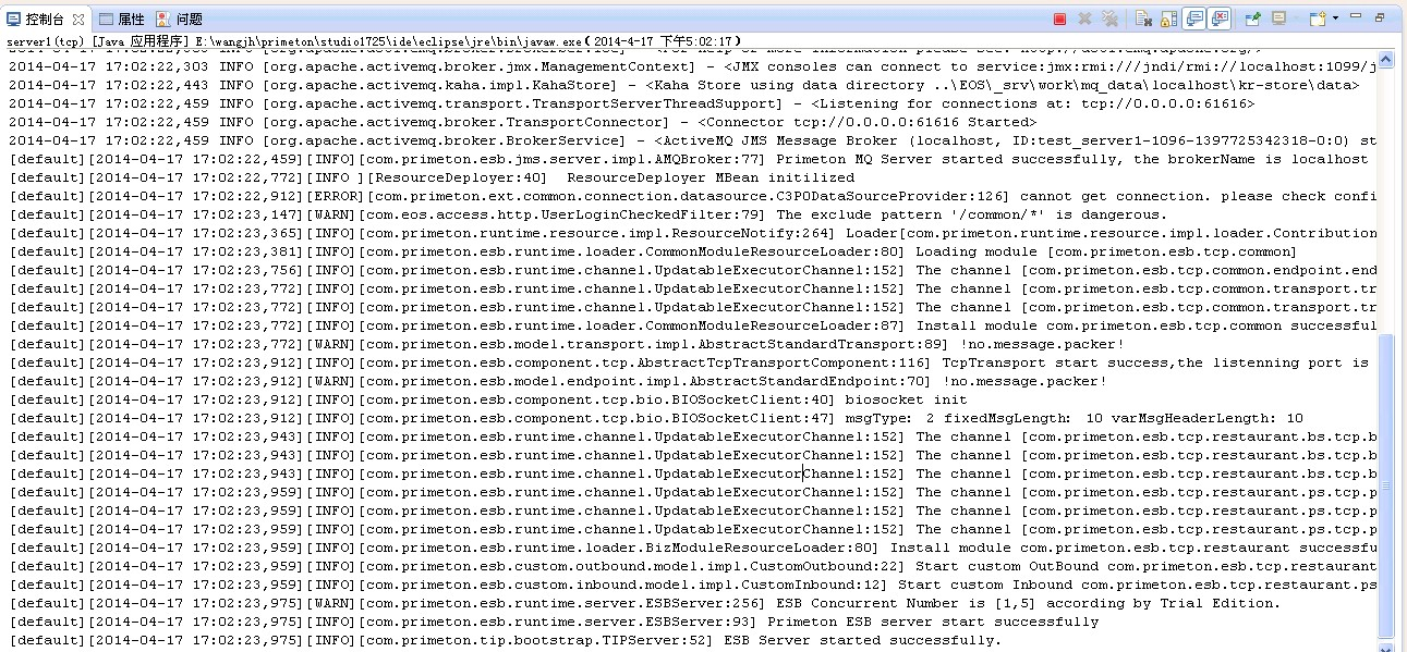 部署完成后,ESB Studio将公共Module和业务Module部署Studio内置的ESB Server上,然后启动ESB Server,如下图所示。