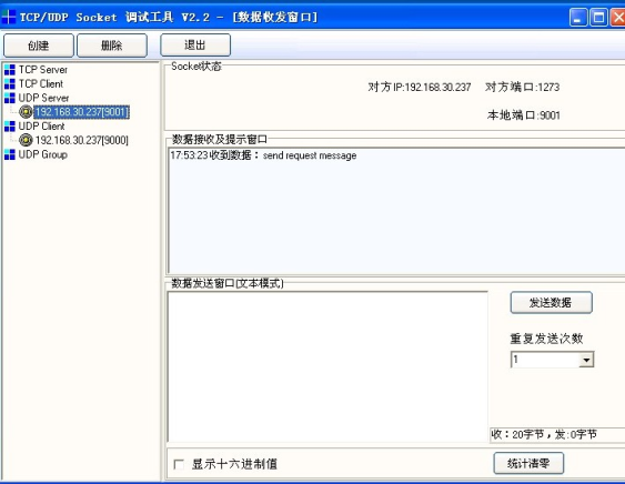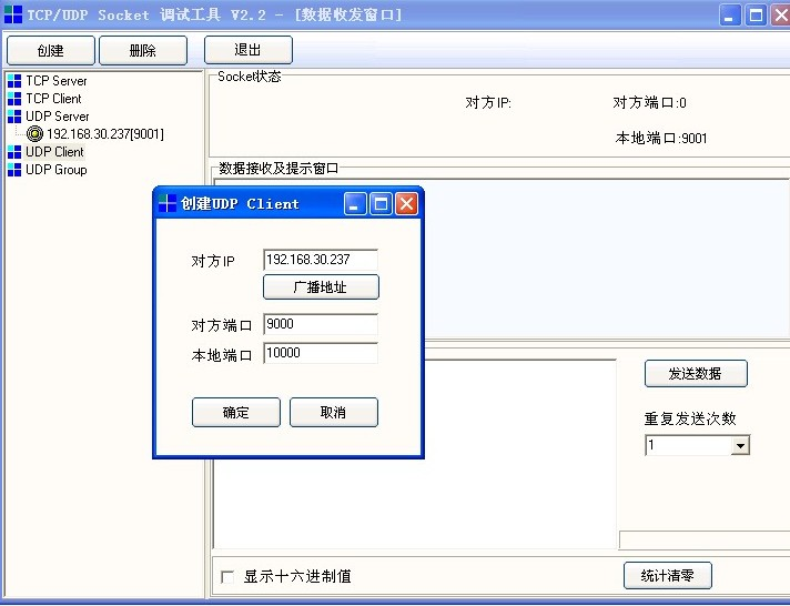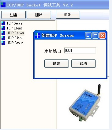 1.通过SocketTool进行测试,创建UDPServer,监听端口对应UDP Endpoint配置的端口9001,如下图所示。